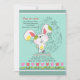 A cute Easter bunny is on the move in this adorable, seasonal invitation. The teal background features a floral Easter egg and a border of red and pink tulips. (FP)