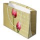 Noble gold parchment with "Happy Easter" Typography and 2 pink tulips.