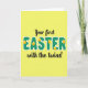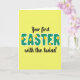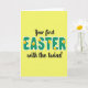 The front design shows a soft lemon-yellow background with a faint repeating grid that gives the surface a gentle texture, setting a cozy spring scene 🌷. Centered in the middle, the large word “EASTER” sits like the main banner, drawn in rounded letters filled with a forest-green plaid pattern and edged with a thin white outline. Tucked into the curves and tops of several letters are small golden egg shapes, each decorated with delicate white markings, like little keepsakes shared between close family members 🐰. Above the big word, “Your first” appears in a flowing black style, arcing lightly as if leaning in for a tender aside. Below, “with the twins!” is written in the same black lettering, placed neatly under the main word to complete the announcement. The spacing around the text feels balanced and close-knit, as though the lines are gathered together in a warm group hug. The eggs are scattered across the lettering at different heights, with white patterns that look like tiny dots and curls against the gold.