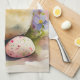 A vintage victorian image of an adorable easter chick surrounded by spring flowers and an egg adorns the waffle-knit custom kitchen towel. Perfect for spring. © Julie McIver