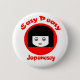 A retro slogan, a Kabuki face, and a cute-as-a-button button.