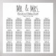 A simple, easy-to-customise black and white wedding reception seating chart with the words "Mr. & Mrs." and the bride and groom's names at the top (Change this text to anything you want). On the right, you can use the template to easily fill in the names of your guests by table. When done with that, choose your poster size and make sure to click "Customise it!" to change any font colours and styles, remove tables, add tables, rearrange/resize things, etc. to truly personalise it for your special day!