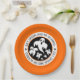 This Halloween party paper plate in orange, black and white colours features a ghost ornament and "Eat, drink and be scared" lettering (can be changed to any message you like).