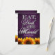Eat Drink and Be Married Rustic Wedding RSVP Cards-match the invitations and more found below on this page. Compliment your sunflower wedding theme with these rsvp cards that feature a purple chalkboard as a background with "Eat, Drink & Be Married" in fun & elegant script with vibrant sunflowers at the bottom of the front and back of each card.These wedding RSVP cards are set to high quality basic card stock; however, you can change the stock to linen, felt (embossed), recycled, and several metallic shades if you would like under number 2 (choose your style, size & paper type) below the orange add to cart button. A list of the additional costs for a fancier card stock are displayed also under that option. Each RSVP card comes with a fitted white envelope.
