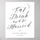 Simple Elegant Calligraphy Script Wedding Reception Eat Drink and be Married Sign in beautiful flowing fancy letters and your personalised names, location, and date. A stylish yet simple formal design in black and white or any background colour you choose. Just click the customise further link, shown under the text personalisation area on the right, and choose your custom colour background. This sign poster template makes it fast and easy to create stunning additions to your wedding decor. Signs can be enlarged, there are many sizes to choose from, as well as options for custom framing and matting. Welcome to our wedding custom signage.