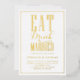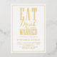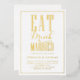 Invite family and friends to your wedding with this customisable gold foil pressed wedding invitation. It features modern calligraphy and simple typography. Personalise this gold foil wedding invitation by adding names, date, time, venue and other event details. This elegant Eat, Drink and Be Married wedding invitation is perfect for any wedding theme.