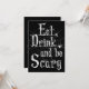 Be super duper scary with this fun saying party invitation. Black background with white cryptic grunge vintage style text in a gothic font with a white spider web and spider crawling. Eat, drink, be scary and have fun! Design Copyright © CustomInvitesOnline.