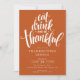 Celebrate Thanksgiving with your loved ones with this stylish and elegant invitation. The invitation features a white script calligraphy font with the saying "eat, drink, and be thankful" set on a burnt orange background. The perfect way to invite your guests to a memorable evening of food, fun, and fellowship.
