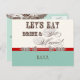Elegant and fun fonts announce the message, "Let's eat, drink and get married!" on a delightful whimsical Maid of Honour invitation postcard. In a warm, retro colour palette of vintage red, aqua blue, cream and chocolate brown - it's the best of vintage with a modern twist. Easily customise your rsvp information on the reverse side.
