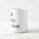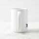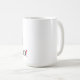 White mug with black text and a red exclamation point