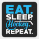 Eat Sleep Hockey Repeat design with blue and white text on a black background, a great design on pillows, mugs, stickers, and other items for hockey players!