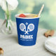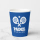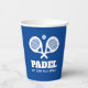 Eat Sleep Play Padel funny custom colour paper cups. Crossed racquet design for kids and adults. Personalise with your own text. Fun disposable party supplies for padel players, tennis friends, club, team etc. Blue or custom background colour. Great for Birthday party, sports event and more.