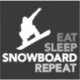 Eat sleep snowboard repeat. White and grey bold type on a solid black background. White silhouette snowboarder.