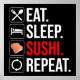 Eat. Sleep. Sushi. Repeat. This funny sushi lover accessory is a great sushi lover gift for a man, woman, girls, boys, teens & kids who love to eat sushi & sashimi at Japanese restaurants, and love wasabi, ginger and soy sauce. If you love Japanese food, and eating tuna maki rolls and nigiri sushi with vinegared rice, this sushi lover accessory is for you!
