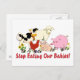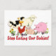 A cow, sheep, pig, rabbit and a chicken say "Stop eating our babies!" Nice way to remind meat eaters that they're eating someone's children.