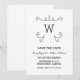 Modern and simple Whimsical Flourish Monogram Save the Date Invitation featuring an elegant swirl motif in black. Easy to customise, simply add your initial and wedding details in the text fields provided. Click "Customise It" to find more personalisation options.