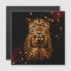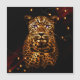 Eclipse Majesty, showcase a leopard with glowing golden fur and distinctive spots, set against a dark background. The leopard's eyes are illuminated in bright purple, creating a striking and mystical effect. The dark surroundings are accented by scattered, warm lights, giving the scene a dramatic almost otherworldly atmosphere.