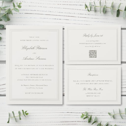 Celebrate your wedding with this ecru modern classic formal romance RSVP, perfect for a black tie wedding, elegant ballroom reception, or formal evening celebration. Designed for neutral palette weddings, luxury ceremonies, and timeless romantic events, this style complements tuxedo and gown dress codes, upscale venues, and sophisticated indoor settings. Ideal for couples planning a traditional wedding with classic accepts and declines wording, this RSVP includes space for guest names and attendance response with a reply-by date. A refined choice for formal weddings, ballroom receptions, and elegant venue celebrations, helping you create a cohesive and memorable wedding experience.