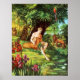 lovely colourful vintage painting of adam in the garden of eden with beautiful flowers, trees, lake, lion, peacock, deer, and elephant, and birds, with adam sitting down next to the water's edge patting the deer. pretty painting with adam from adam and eve story of genesis in the old testament, as he sits next to the water a deer sits near him, a lion looks on, a parrot sits on a tree, a peacock, sits on a tree branch, and an elephant is coming towards him in the distance, with pink and purple flowers, big palm tree, and lakes.