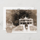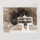 A young female sits in front of a small wooden house at the Eden Springs Zoo, House of David greeting card.