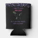 A can cooler with a unicorn drawing. A fluffy cloud at the end of a rainbow in the background. Pink and purple watercolor confetti decorate the top border. The