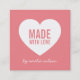 Modern minimalist business card with the word "Made with Love" in bold font against a white heart and a stylish script for your name or store name. This versatile business card has an editable background colour (change it to whatever you like) and change font colour to match as well which you can access by clicking "customise" button. This card also works well as a gift tag, favour tag or product tag.