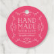 Stylish tag with the words "Hand Made with Love" between flourishes all in white against an editable background colour (click customise to change). This tag is great for crafters and makers of handmade goods, like artists, knitters, dressmakers. It can be used when gifting your handmade goods or as product tags