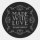 Stylish sticker with the words "Made with Love" between flourishes all in white against an editable background colour (click customise to change). This sticker is great for crafters and makers of handmade goods, like artists, knitters, dressmakers. It can be used when gifting your handmade goods or as product labels.