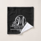 Elegant split monogram letter M Bath towel set set on a black background. Background colour can easily be changed by clicking on "Personalise this template" to "Click to customise further" then on the left hand side under layers you will find the background colour link. Click on it and change your colour!