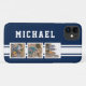 A sporty varsity style phone case with 3 photos arranged one below the other in front of a line of white stripes all against an editable background colour (click "customise" to change background colour).