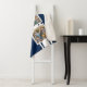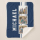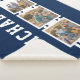 A sporty varsity style blanket with 3 photos arranged one below the other in front of a line of white stripes all against an editable background colour (click "customise" to change background colour).