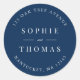 Editable Colour Wedding Return Address Modern Classic Round Sticker with text in white against an editable background colour; to change it from blue to a colour of your choice, click the customise button.