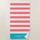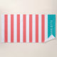 Nautical style beach towel featuring a white stripes pattern with an editable background colour, click the customise button for access. To change the coral colour, select background colour and change its colour. To change the turquoise colour, select rectangle layer and change its fill colour.