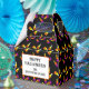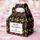 A party favour box with editable grunge letters reading 'Happy Halloween', and room for your name or message underneath, on a colourful pattern of Halloween candy corn in yellow and orange.