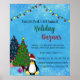 This cute poster features an illustration of a penguin with a Santa hat sitting in front of two decorated Christmas trees and gifts. Christmas lights hang from above. To the right are the details of the event. The text is editable so change the details as well as the font size, style and colour.