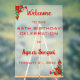 This editable acrylic sign features messages and information about an event over a frosted glass look and with red flowers in two corners. The text is editable so go ahead and change the details as well as the font colour, size and style. This sign can be used for any event: retirement, anniversary, birthday etc.