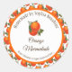 A custom sticker with vintage crate art of oranges with small blossoms on the background and label, with brown retro and script letters for your handmade recipe, your name or company, and more info.