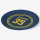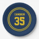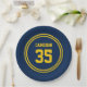 Paper plates featuring a sporty font and round stripes border with editable colours (click customise, select "VarsityStripesRound1" and change each of the stripe colour to a colour of your choice) against a background colour that is also editable (click customise and change background colour). These plates are great for any sports related celebration, graduation or a sports themed birthday.