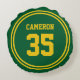 This throw pillow features a sporty font and round stripes border with editable colours (click customise, select "VarsityStripesRound1" and change each of the stripe colour to a colour of your choice) against a background colour that is also editable (click customise and change background colour). Make your colour changes on both sides of the pillow.