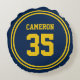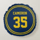 This throw pillow features a sporty font and round stripes border with editable colours (click customise, select "VarsityStripesRound1" and change each of the stripe colour to a colour of your choice) against a background colour that is also editable (click customise and change background colour). Make your colour changes on both sides of the pillow.