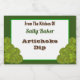 A custom recipe sticker with retro artichokes in the corners reading "From the Kitchen Of" with editable green script and brown bold letters for your name and recipe, on a hunter green background.
