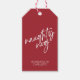 Red script naughty nog eggnog label with name and pine branch pattern back.