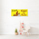 This funny customisable vinyl banner has a cartoon red laying hen holding up a basket of eggs.