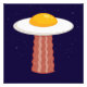 Vector cartoon illustration of a delicious sunny side up fried egg UFO with a yummy bacon slice tractor beam. Keywords: egg, bacon, breakfast, UFO, alien, sunny, side, cartoon, space, extraterrestrial, food, cute, yolk, sci-fi, science, fiction, martian, humour, meat, pork, abduction