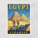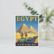 Blend ancient history with mid-century adventure with this unique retro travel postcard for Egypt. The design features the majestic Pyramids of Giza serving as the backdrop for a classic road scene, complete with vintage cars and travelers riding camels. This vibrant, stylized artwork is perfect for lovers of bold graphic design, historical landmarks, and the glamour of 20th-century exotic travel.