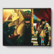 Egyptian Queen with red dragon on her shoulder. The Queen is holding an orb of a universe. A black lion with wings is on a mountain with a sphinx in behind.