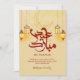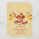This design focuses on light and spirituality, featuring a large golden crescent moon and glowing lanterns that illuminate a central starburst. A bright and hopeful card for the Eid season.