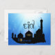 Black silhouette of a mosque on a blue sky with sun and sunrays, greetings and wishes for Eid.