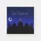 Eid Mubarak greeting illustration: Eid Mubarak lettering made with glowing stars. Islamic symbol moon with star and a mosque silhouette on a night sky background.