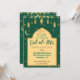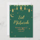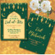 *Available in paper and digital "instant download" ecard formats, for sending by email or text.* Invite friends and family to celebrate the end of Ramadan with this modern, elegant Eid party invitation, in rich emerald green, gold, and swirling script typography. Featuring shimmering lanterns, stars and a crescent moon, this invitation reads: "Please join us for a party to celebrate Eid al-Fitr" and has room for your date/time, address and rsvp details. Invitation back reads "Eid Mubarak" with room to add a personal message. Great for Eid parties, dinners, and gatherings or all types. May be easily customised for Eid al-Adha.